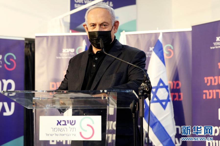 12月19日,在以色列拉马特甘的谢巴医疗中心,以总理内塔尼亚胡接种新冠疫苗后发表讲话。