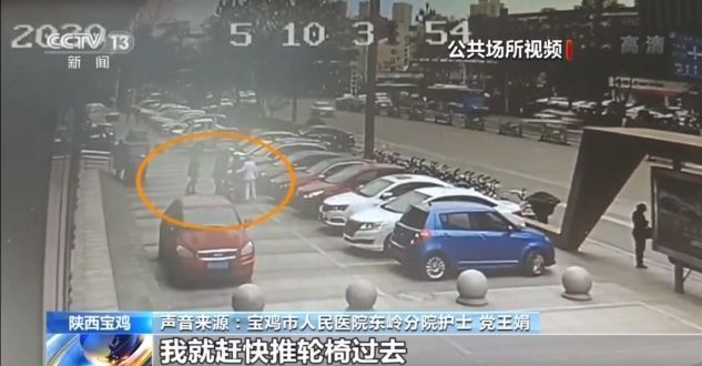 宝鸡市人民医院东岭分院护士 党王娟:出去一看是有人摔倒了,我就赶快推轮椅过去,去到现场的时候,老太太的右脚已经不能着地了。