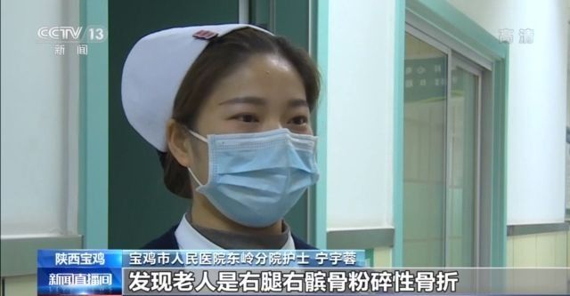 宝鸡市人民医院东岭分院护士 宁宇蓉:做完检查后,发现老人是右腿右髌骨粉碎性骨折,然后我们就紧急联系宝鸡市人民医院,同时我们也联系到老人的家属。