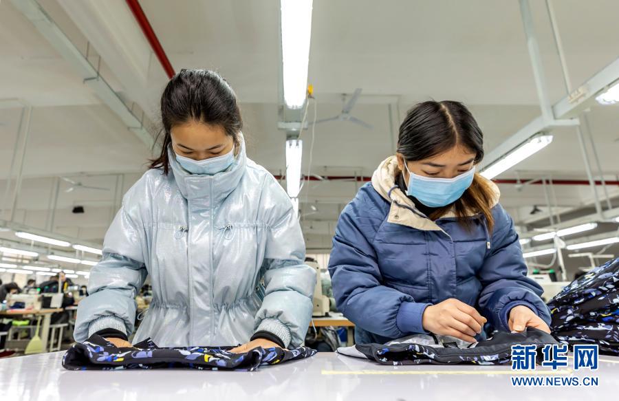 12月19日,工人在贵州省毕节市黔西县岔白工业园区一家制衣企业的生产车间检测产品质量。
