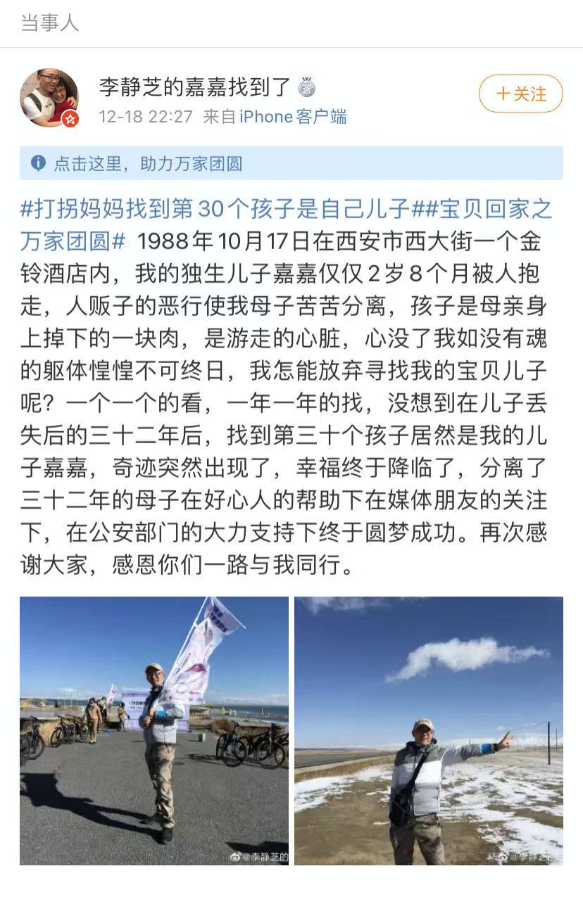 事件重登热搜后,12月18日,李静芝发了一条微博:“孩子是母亲身上掉下的一块肉,是游走的心脏,心没了我如没有魂的躯体惶惶不可终日,我怎能放弃寻找我的宝贝儿子呢?”