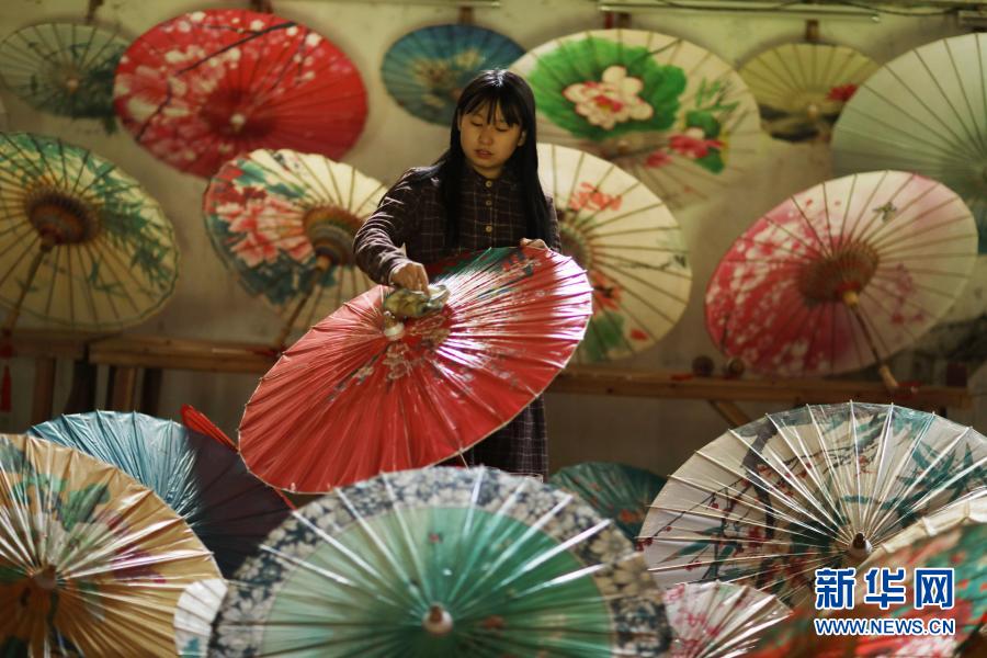 12月20日,在贵州省赤水市大同镇,一名工人在给伞面抹桐油。