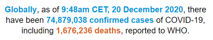 根据世卫组织最新实时统计数据,截至欧洲中部时间12月20日9时48分(北京时间12月20日16时48分),全球累计新冠肺炎确诊病例74879038例,累计死亡病例1676236例。(总台记者 朱赫)