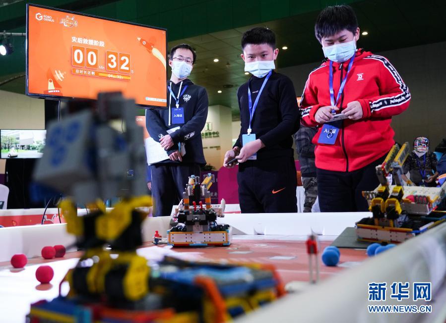 12月20日,在北京中国科学技术馆内举办的2020 Robo Genius人工智能与机器人挑战赛总决赛上,参赛选手(右一、右二)操控机器人完成比赛任务。