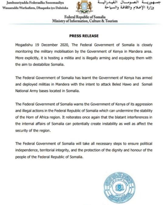 声明说,“肯尼亚政府正在武装和部署民兵组织,目的是破坏索马里的稳定。”声明还说,“肯尼亚的行动,可能影响非洲之角的稳定,索马里将采取一切必要步骤,以确保政治独立、领土完整。”