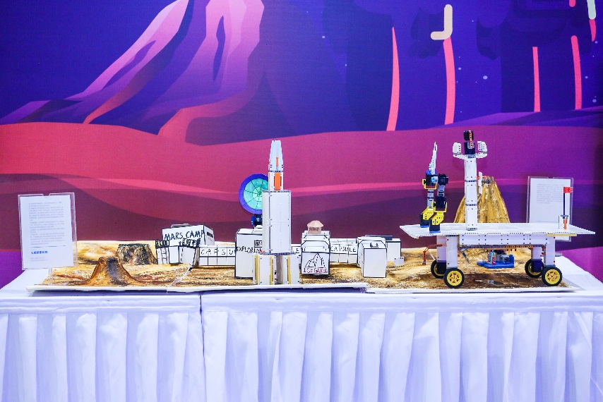 本次总决赛的现场还打造了一个充满想象的火星场景化嘉年华——火星主题竞赛、火星生存体验区、火星想象展示区,沉浸式体验让科普内容更加生动。同期还举办了火星科普创意应用作品征集和评比活动,孩子们动手创造火星科普作品,诠释属于自己的航天梦想。其中,武汉澳门路小学的学生创作了火星探测器和火星探测机器人,杭州余杭区塘栖镇宏畔中心小学的学生带来了火星上的智能房车、杭州余杭区瓶窑中学的学生为火星生活规划了沙盘、贵阳九中的学生用智能机器人模拟了“天文一号”从发射到分离到着陆的全过程……各地学生大开脑洞,用手中的材料和智能硬件表达着对“探火”计划的支持。