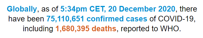 根据世卫组织最新实时统计数据,截至欧洲中部时间12月20日17时34分(北京时间12月21日0时34分),全球累计新冠肺炎确诊病例75110651例,累计死亡病例1680395例。20日全球新冠肺炎确诊病例新增808224例,单日新增病例数创疫情暴发以来最高纪录,死亡病例新增10312例。