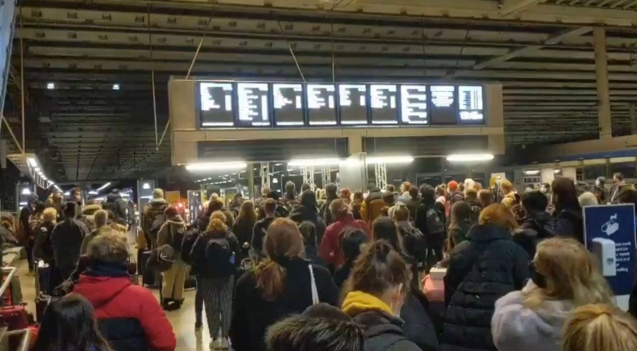 △伦敦帕丁顿火车站周六(19日)晚挤满了旅客,铁路部门表示,人员过于密集,无法保持安全的社交距离。