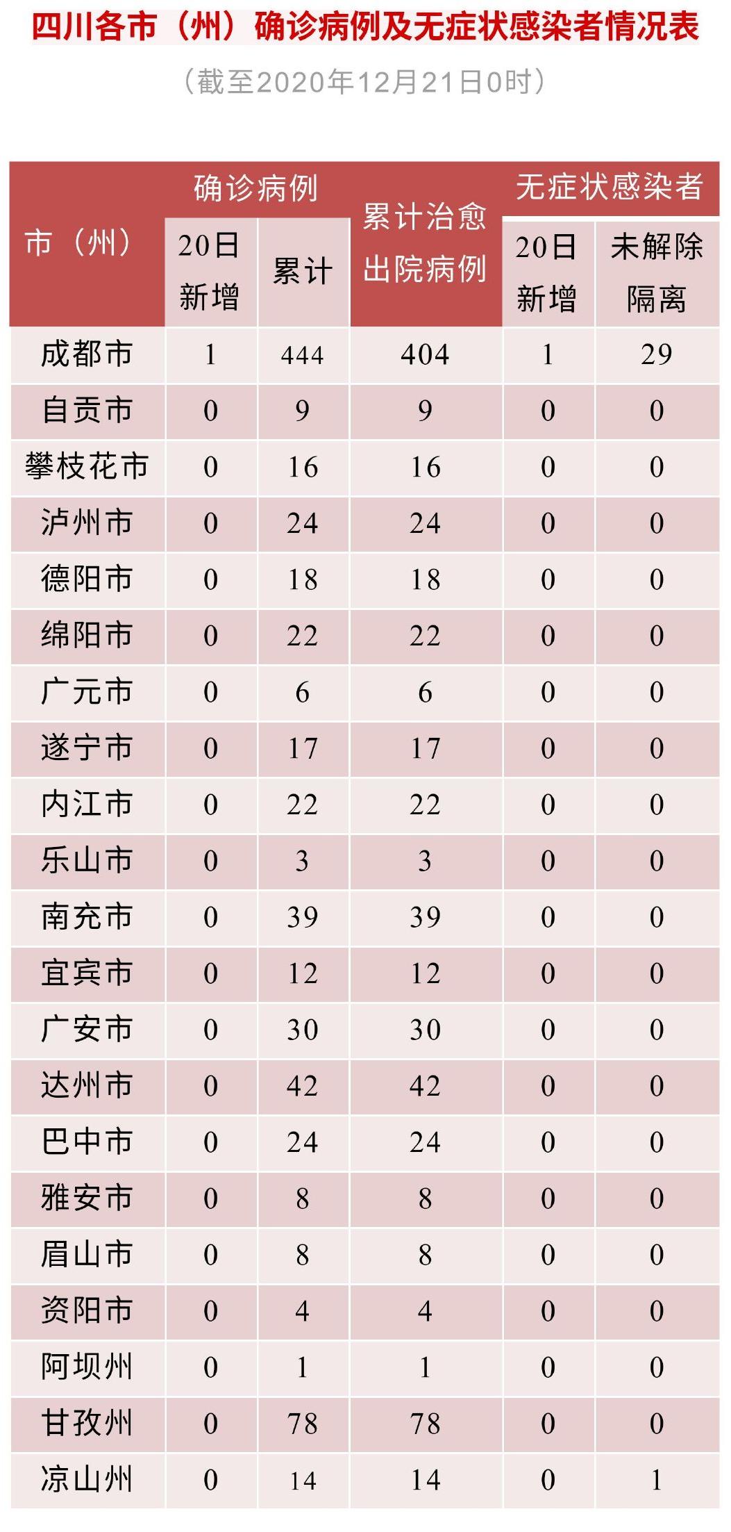 12月20日0—24时,四川新增新冠肺炎确诊病例1例(境外输入,12月13日自尼泊尔乘机抵蓉,12月20日确诊),新增治愈出院病例1例,无新增疑似病例,无新增死亡病例。