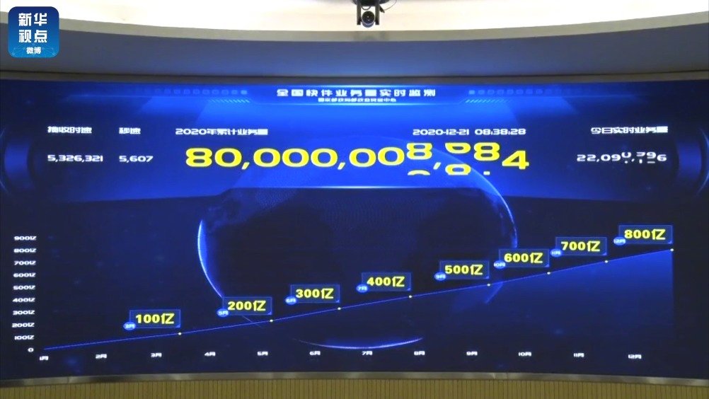 【800亿件,#快递业务量实现四连跳#!】根据国家邮政局监测数据显示,12月21日,#我国快递年业务量首次突破800亿件#。今年我国快递业务量实现了从500亿、600亿、700亿、800亿的四连跳。1月,受新冠肺炎疫情及春节双重因素影响,我国快递业务量首次出现负增长,同比下降16%左右。随着复工复产复市持续推进,快递业务增速转正,重回30%以上的高速增长区间。当前,邮政快递业日均2亿多件已成常态,日均服务用户近4亿多人次,服务民生作用更加凸显。(记者赵文君) 新华视点的微博视频