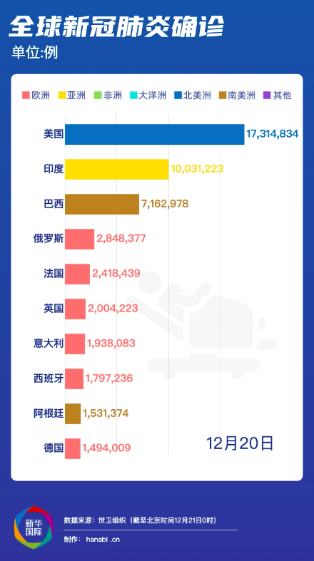 美国约翰斯·霍普金斯大学:截至北京时间21日7时27分,全球新冠确诊病例达76750811例,死亡病例为1692067例。美国是全球疫情最严重的国家,确诊病例达17819583例,死亡病例为317588例。