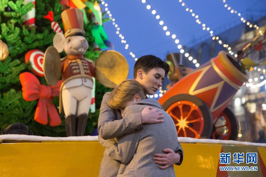 12月20日,一对情侣在俄罗斯圣彼得堡圣诞集市上拥抱。