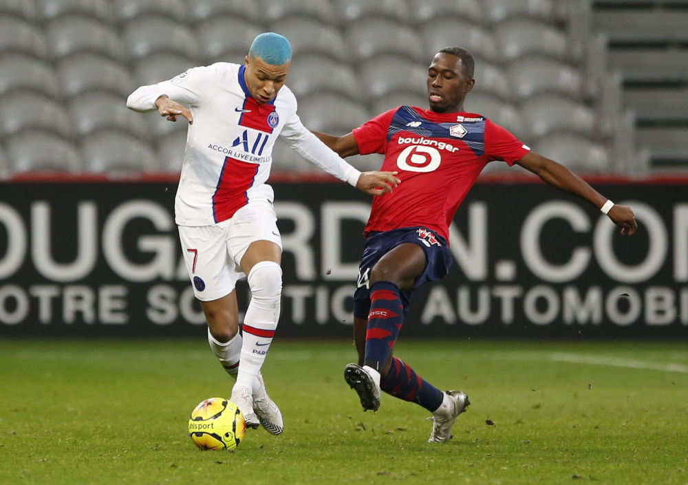 巴黎圣日耳曼队球员姆巴佩(左)在比赛中和里尔队球员苏马雷拼抢。新华社/路透