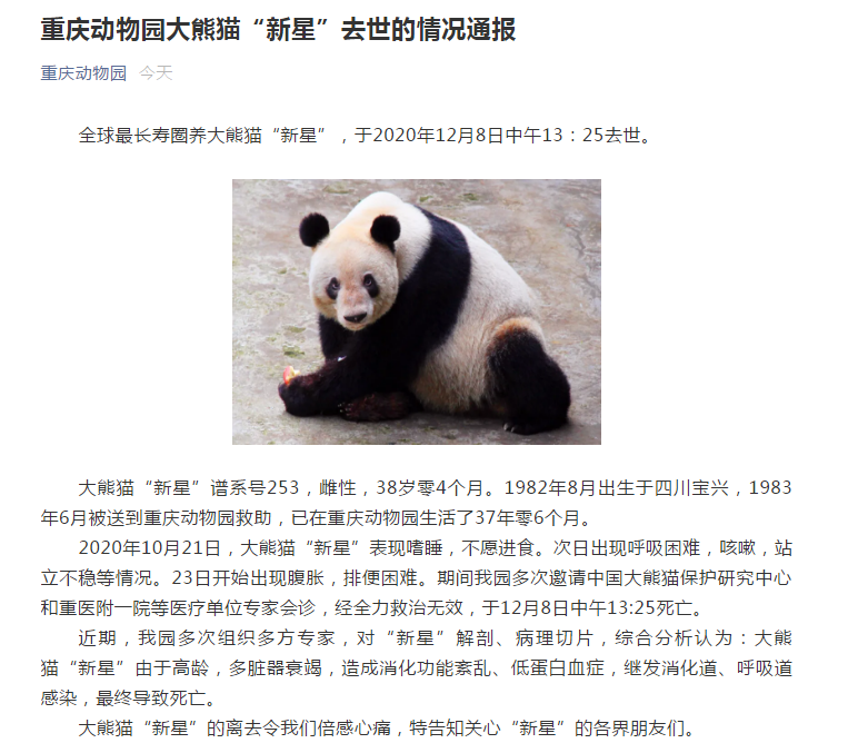 全球最长寿圈养大熊猫“新星”,于2020年12月8日中午13:25去世。