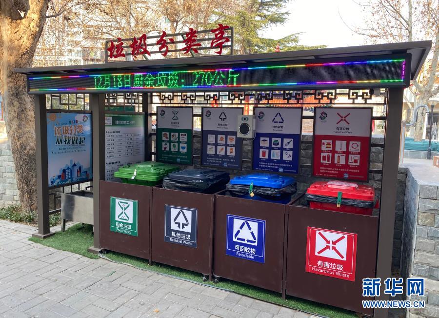 这是济南市市中区乐山小区里的垃圾分类亭,四种颜色的垃圾桶分别用来盛放厨余、可回收、有害和其他类垃圾(12月20日摄,手机照片)。新华社记者 陈国峰 摄