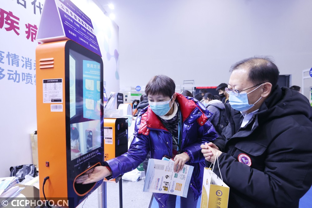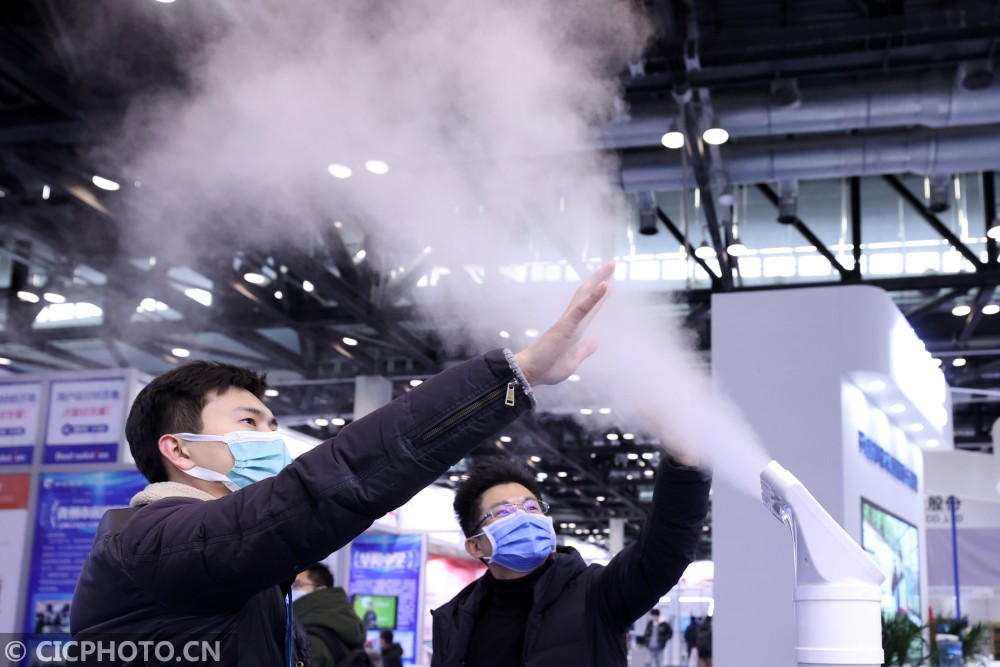 ↑2020年12月18日,在北京国家会议中心,观众在体验手部消毒智能雾化机。CICPHOTO/陈晓根 摄