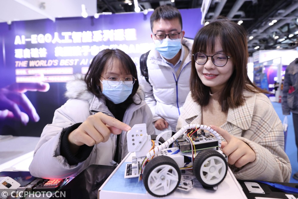 ↑2020年12月18日,在北京国家会议中心,观众在了解课堂用的人工智能无人车。CICPHOTO/陈晓根 摄