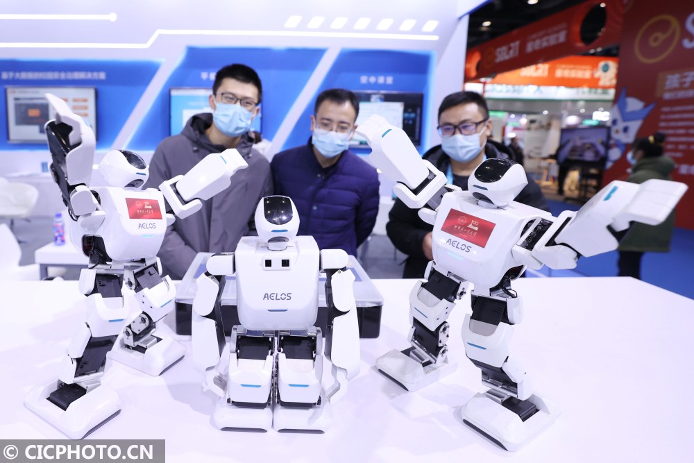 ↑2020年12月18日,在北京国家会议中心,人们在观看智能型机器人跳舞。CICPHOTO/陈晓根 摄