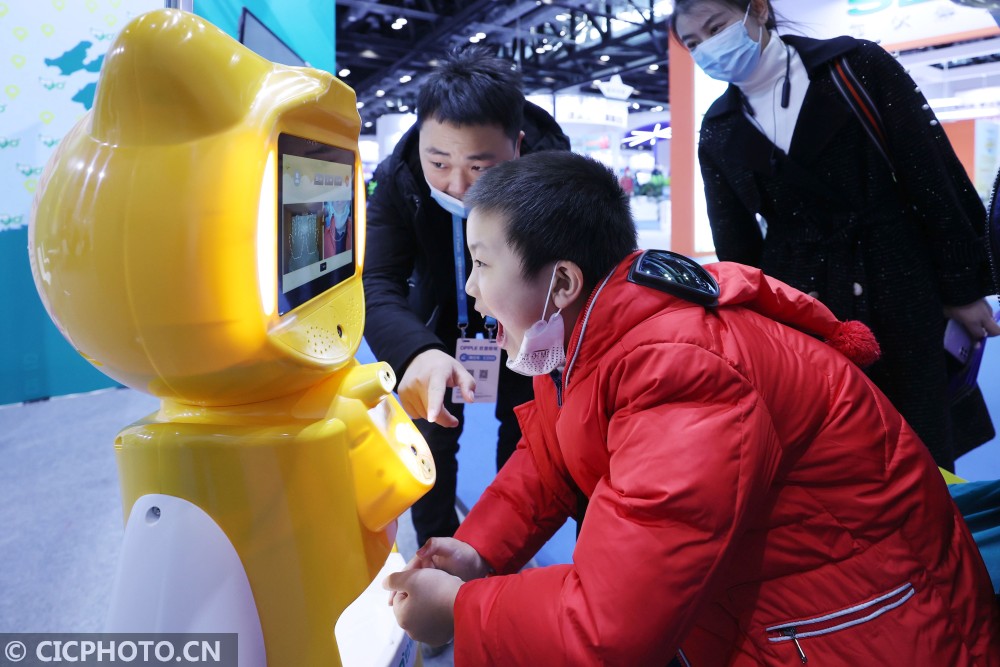 ↑2020年12月18日,在北京国家会议中心,小朋友在体验幼儿晨检机器人。它是一款具有健康检测、安全管理,信息服务和教育娱乐功能的机器人。CICPHOTO/陈晓根 摄