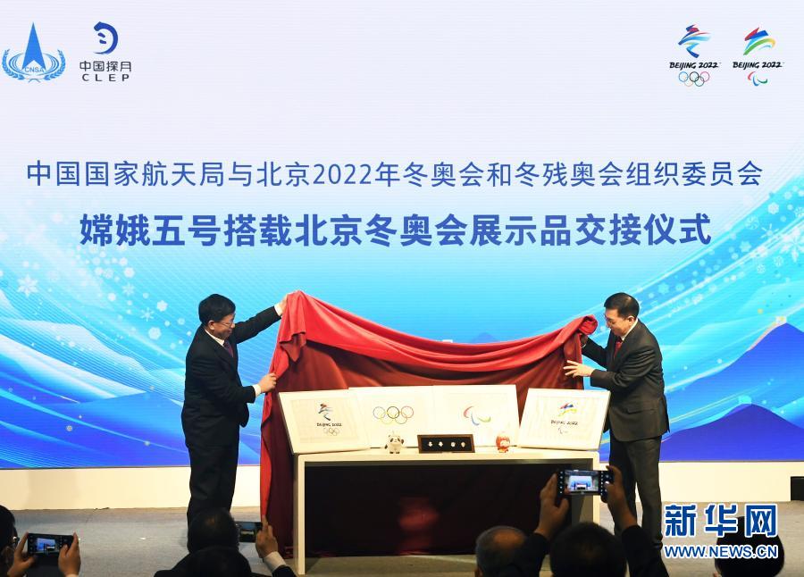 当日,中国国家航天局与北京2022年冬奥会和冬残奥会组织委员会嫦娥五号搭载北京冬奥会展示品交接仪式在北京冬奥组委首钢办公区举行。