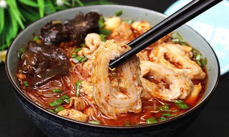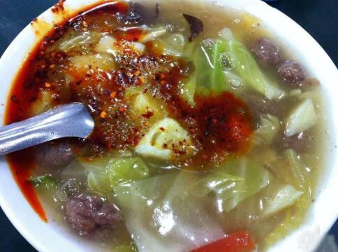 西安的肉丸胡辣汤,主打肉丸,辅以莲花白、胡萝卜、土豆西葫芦等蔬菜。制作时将时鲜蔬菜放置锅内和肉汤熬制数小时,出锅时勾芡,添上店家精心熬制的辣椒油,一碗稠糊糊、香喷喷的胡辣汤就完美呈现了,再配着腊牛肉夹馍或饦饦馍,一口馍一口汤,便成了西安人最爱的早餐。
