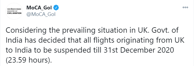 印度民航部当地时间21日下午在社交媒体发布消息称,鉴于英国当下的疫情形势,印度航空管理部门决定从22日禁飞所有往返英国的航班,该禁飞令将持续到12月31日。此外,22日前从英国抵达印度的所有乘客都必须进行核酸检测后方可入境。(总台记者 王建兵)