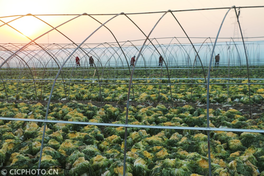 ↑2020年12月21日,江苏省连云港市灌云县南岗镇岗东村,村民在为越冬蔬菜加盖保温膜。CICPHOTO/吴晨光 摄