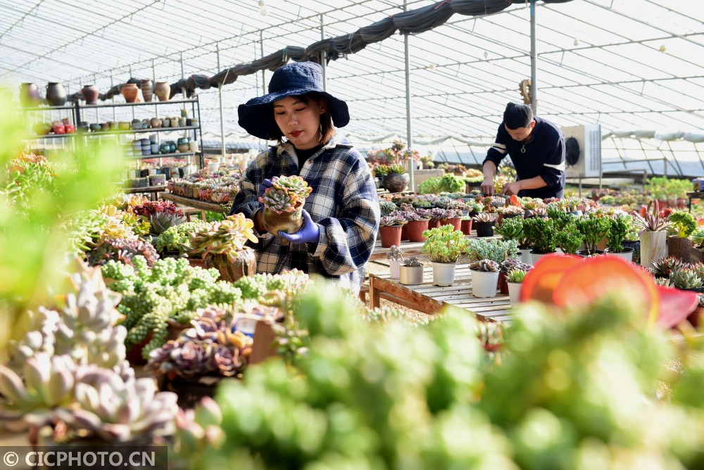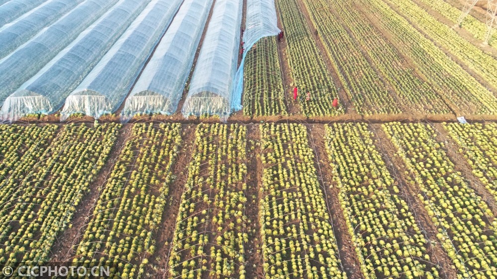 ↑2020年12月20日,在河北省石家庄新乐市东杨家庄村,农民在大棚里管理花卉。CICPHOTO/贾敏杰 摄