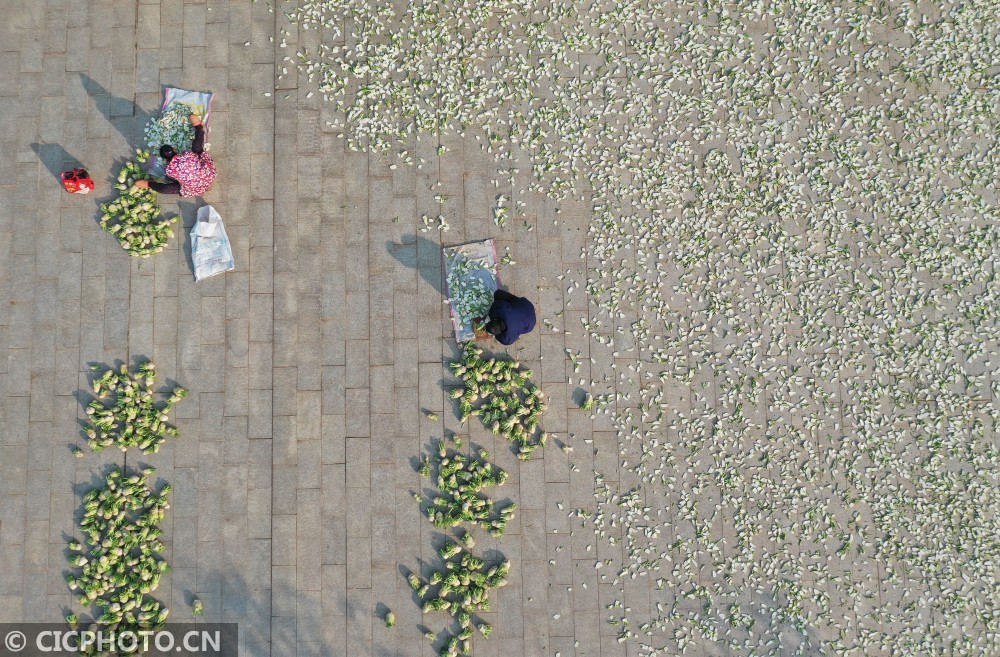 ↑2020年12月21日,湖南省道县营江街道小洞社区,村民在切晒大头菜。(无人机拍摄)CICPHOTO/何红福 摄