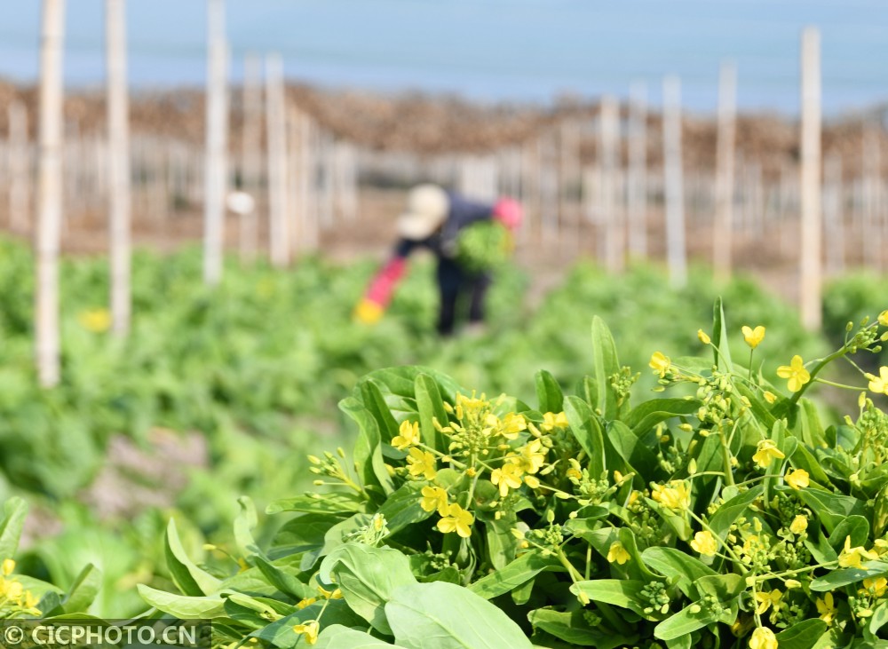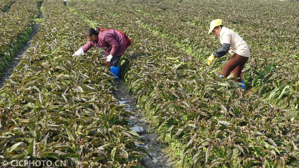 ↑2020年12月21日,湖南省永州市江永县千家峒瑶族乡凤岩山村,农民在采收菜薹。CICPHOTO/潘百旺 摄