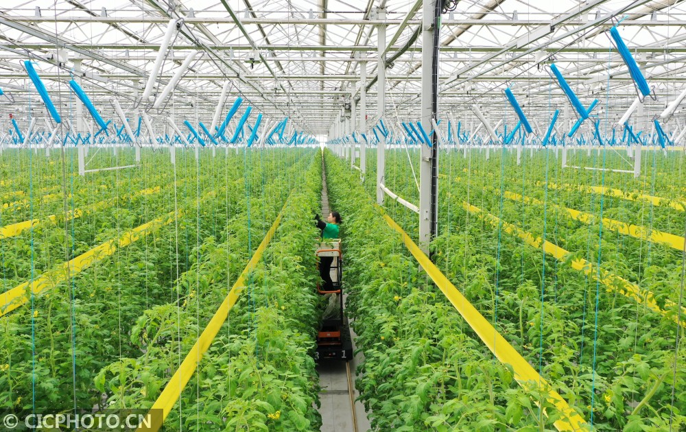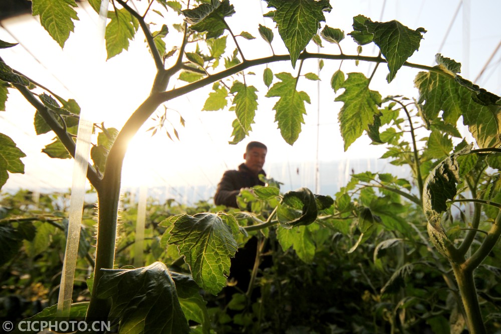 ↑2020年12月21日,山东省枣庄市光明路街道岳楼村,农民在温室大棚内管理西红柿。CICPHOTO/吉喆 摄
