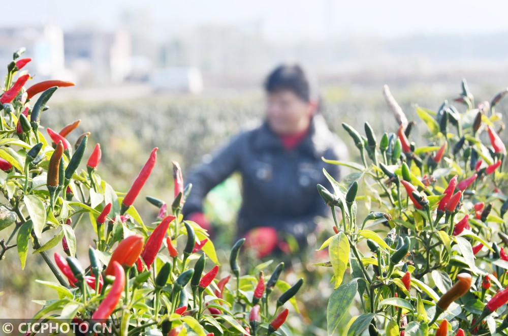↑2020年12月21日,湖南省永州市江永县千家峒瑶族乡凤岩山村,农民在采摘辣椒。CICPHOTO/田如瑞 摄
