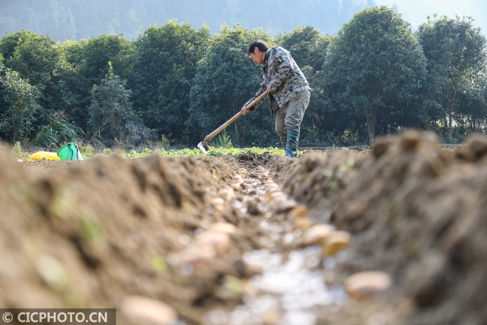 ↑2020年12月20日,湖南省湘西土家族苗族自治州吉首市乾州街道西门口村,农民在地里种植马铃薯。CICPHOTO/张术杰 摄