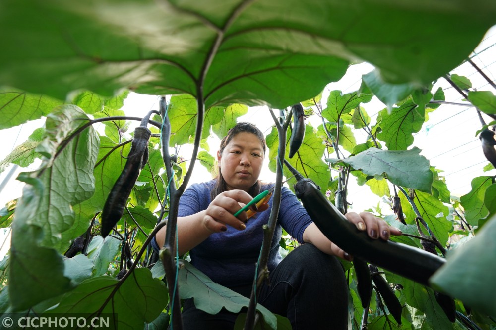 ↑2020年12月21日,农户在河北省邢台市巨鹿县西郭城镇南盐池村果蔬大棚内收获茄子。CICPHOTO/胡良川 摄