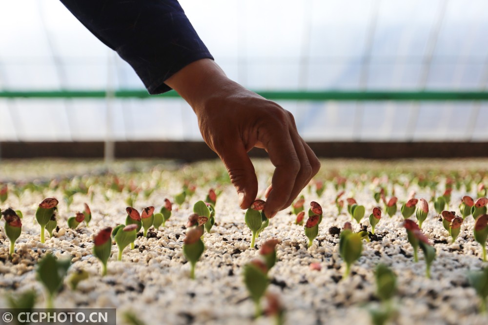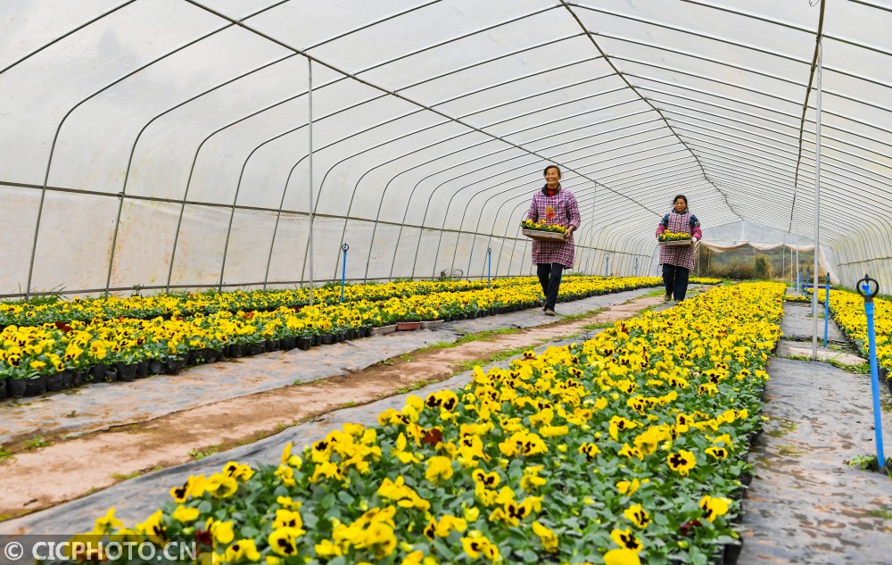 ↑2020年12月20日,四川省广安市广安区大龙镇战斗村,村民在花卉大棚内装盘转运花卉。CICPHOTO/张国盛 摄