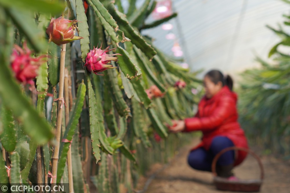 ↑2020年12月21日,河北省邢台市内丘县辛东庄村,农民在大棚内采摘火龙果。CICPHOTO/刘继东 摄