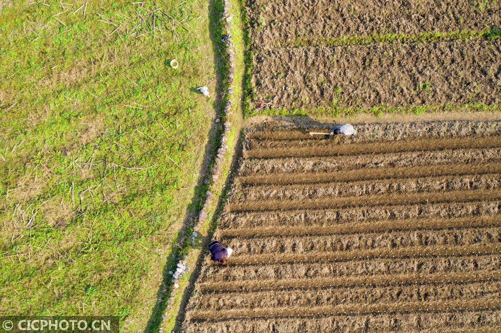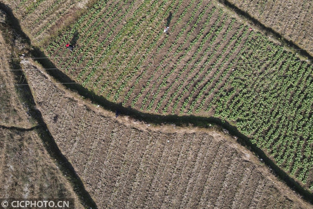 ↑2020年12月21日,湖南省湘西土家族苗族自治州吉首市西门口村,村民在田间劳作。(无人机拍摄)CICPHOTO/刘振军 摄