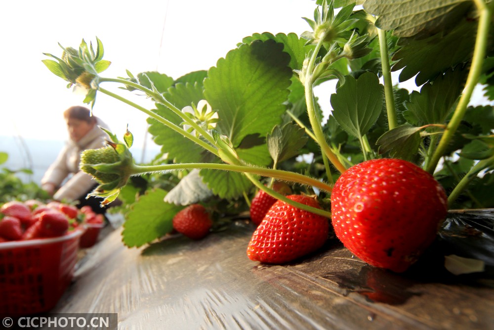 ↑2020年12月21日,山东省枣庄市光明路街道岳楼村,农民在温室大棚内采摘草莓。CICPHOTO/吉喆 摄