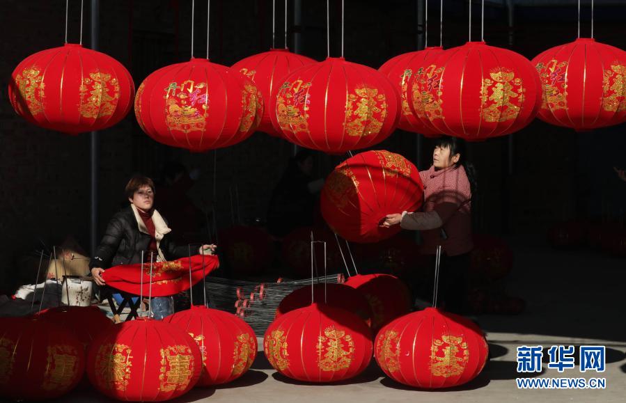 12月21日,在河南省武陟县西陶镇石荆村一家灯笼加工厂,工人在制作大红灯笼。新华社发(冯小敏 摄)