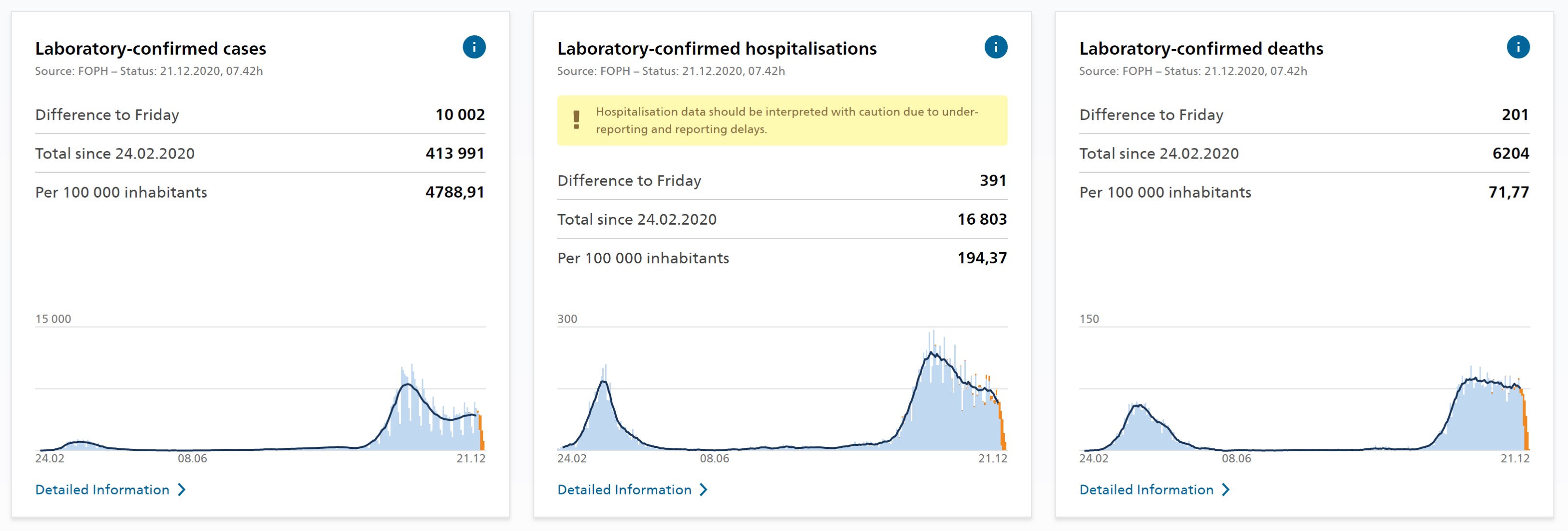 根据瑞士联邦公共卫生部当地时间21日公布的疫情数据,瑞士和列支敦士登公国新冠肺炎累计确诊病例达413991例,较上周五(18日)新增10002例;累计死亡6204例,较上周五新增201例;累计住院治疗16803例,较上周五新增391例。