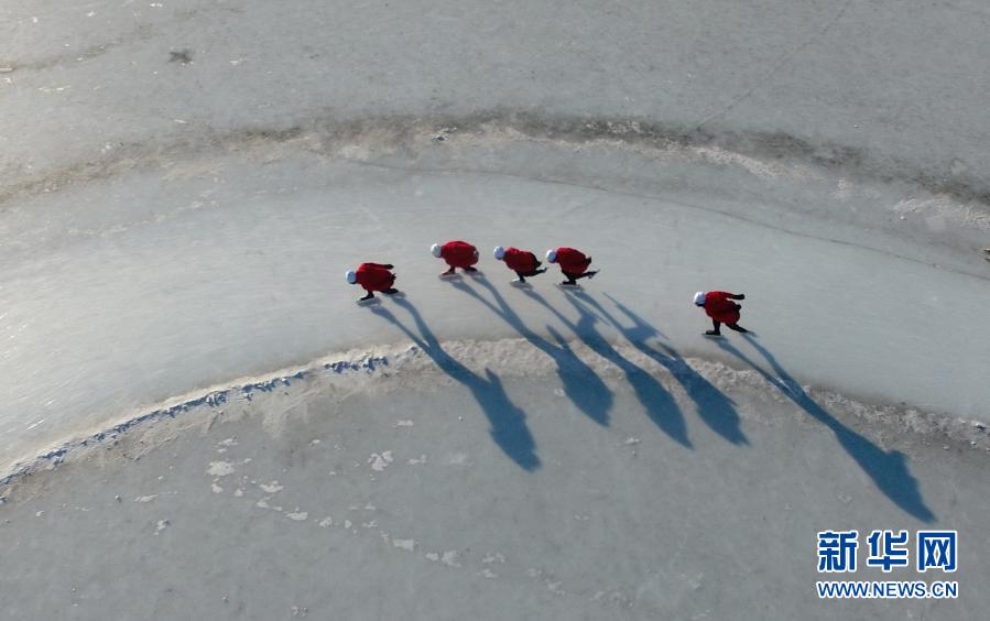 12月21日,在黑龙江牡丹江市月牙湖天然冰场,滑冰爱好者在冰面追逐(无人机照片)。