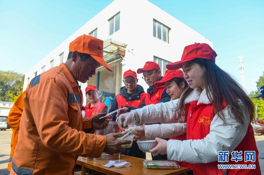 12月21日,在余姚市中山路环卫站,志愿者将饺子送到环卫工人手中。新华社记者 徐昱 摄