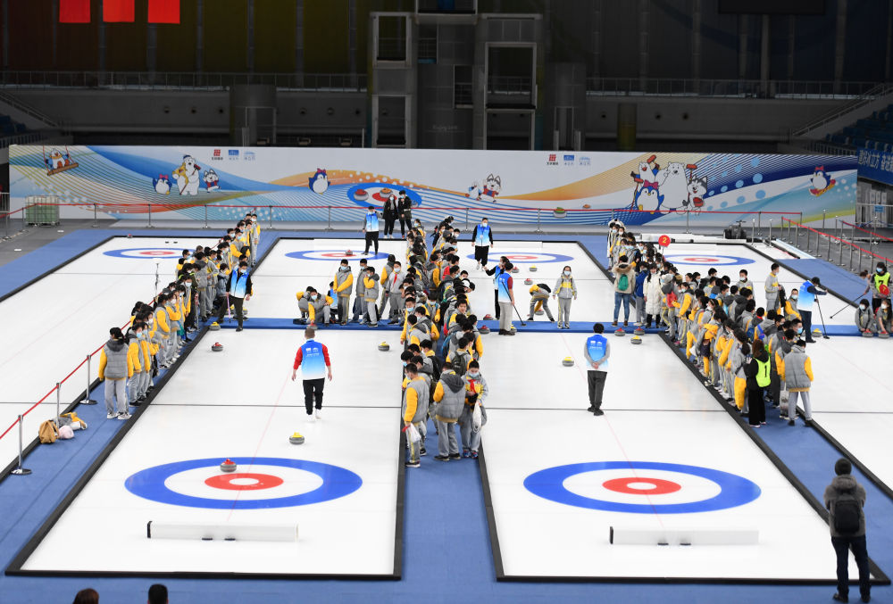 来自北京市第二中学的初中生正在体验冰壶项目。新华社记者张晨霖摄