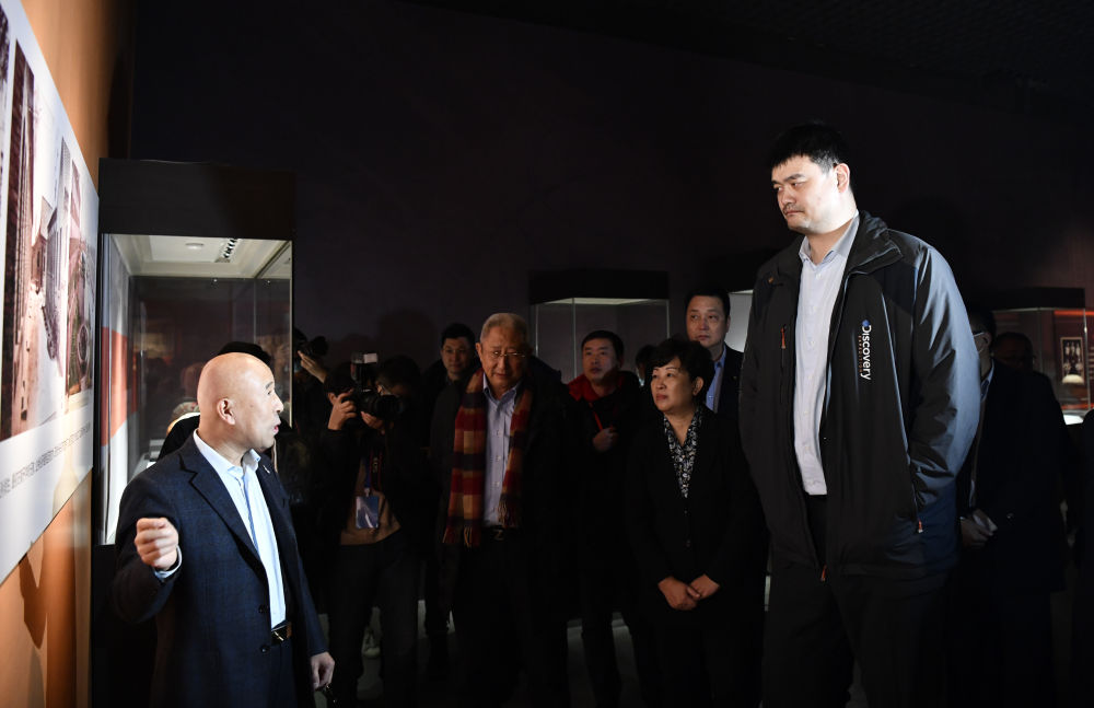 中国篮球协会主席姚明(右一)在展览现场参观。新华社记者李然摄