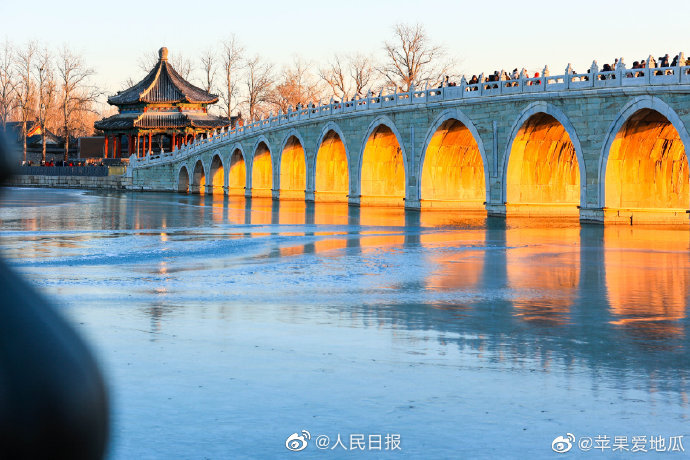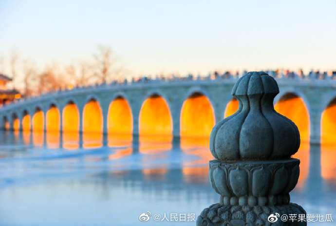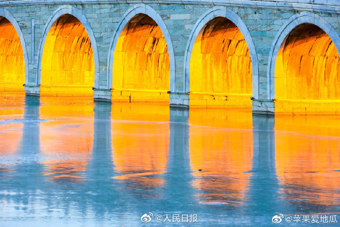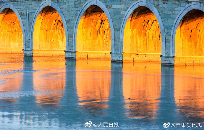 冬至前后,阳光恰好照射在颐和园十七孔桥所有桥洞的侧壁上,呈现出“金光穿洞”的美景。戳图去颐和园十七孔桥赴一场金光穿洞的盛会。(来源:人民日报微博)