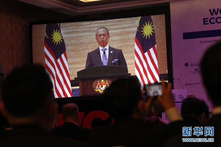 12月21日,在马来西亚吉隆坡举行的世界华人经济峰会上,大屏幕播放马来西亚总理穆希丁的视频讲话。