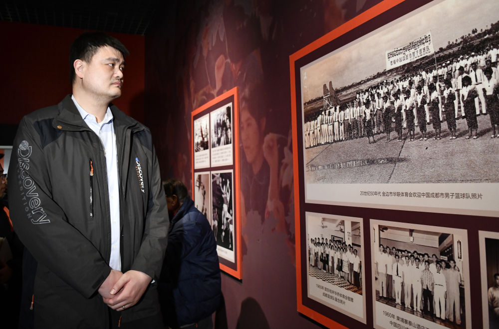 中国篮球协会主席姚明(左二)在展览现场参观。新华社记者李然摄