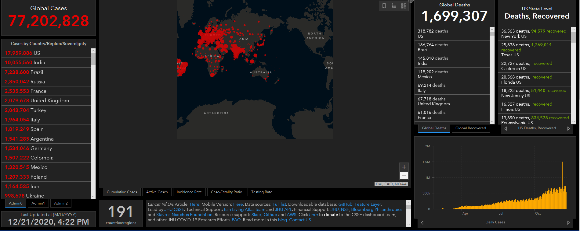 根据美国约翰斯·霍普金斯大学截至美东时间21日16时22分数据,美国新冠感染人数达到17959886人,死亡人数逼近32万,达到318782人。(央视记者 殷岳)