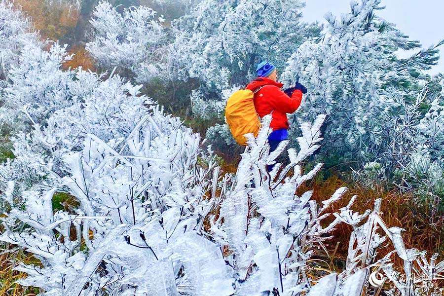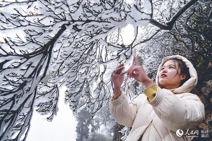 宁德霞浦县水门乡玉山雾凇景观吸引不少游人拍照留念。郑培銮 摄