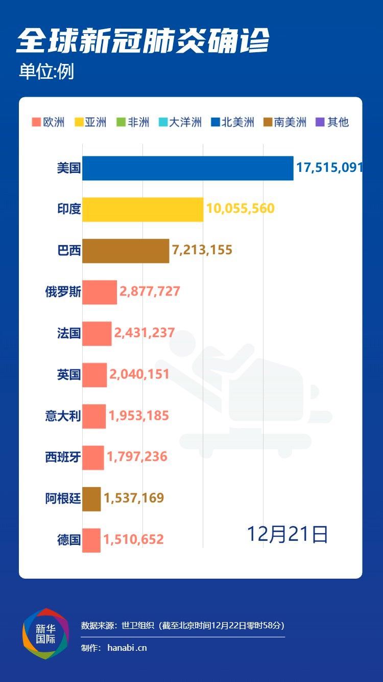 美国约翰斯·霍普金斯大学:截至北京时间22日8时22分,全球新冠确诊病例达77307971例,死亡病例为1701085例。美国是全球疫情最严重的国家,确诊病例达18011449例,死亡病例为319255例。